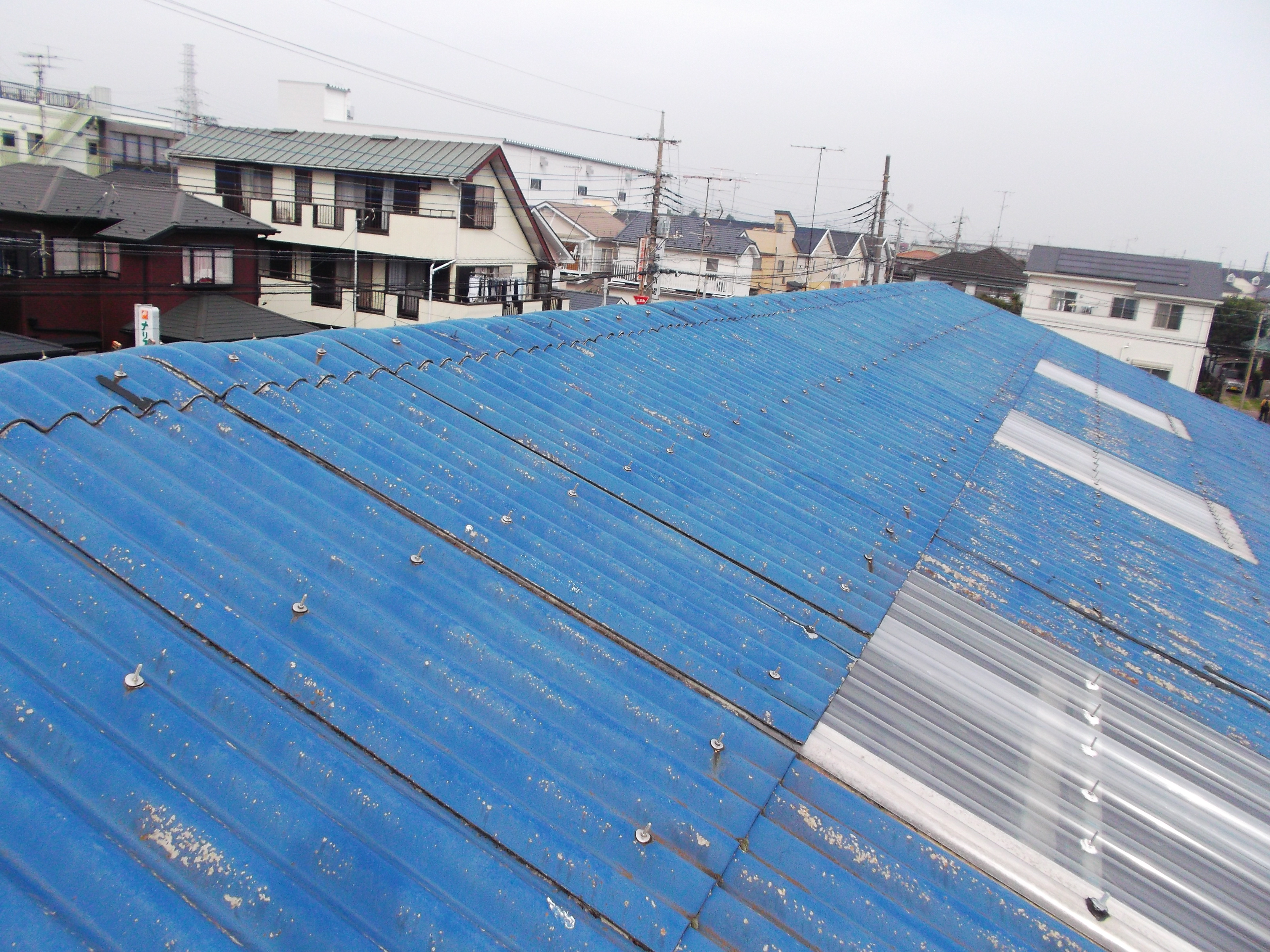 多くはアスベストを含んでおり、解体すると費用が莫大になるため、はがさずに屋根が葺ける重ね張りが多く用いられてます。